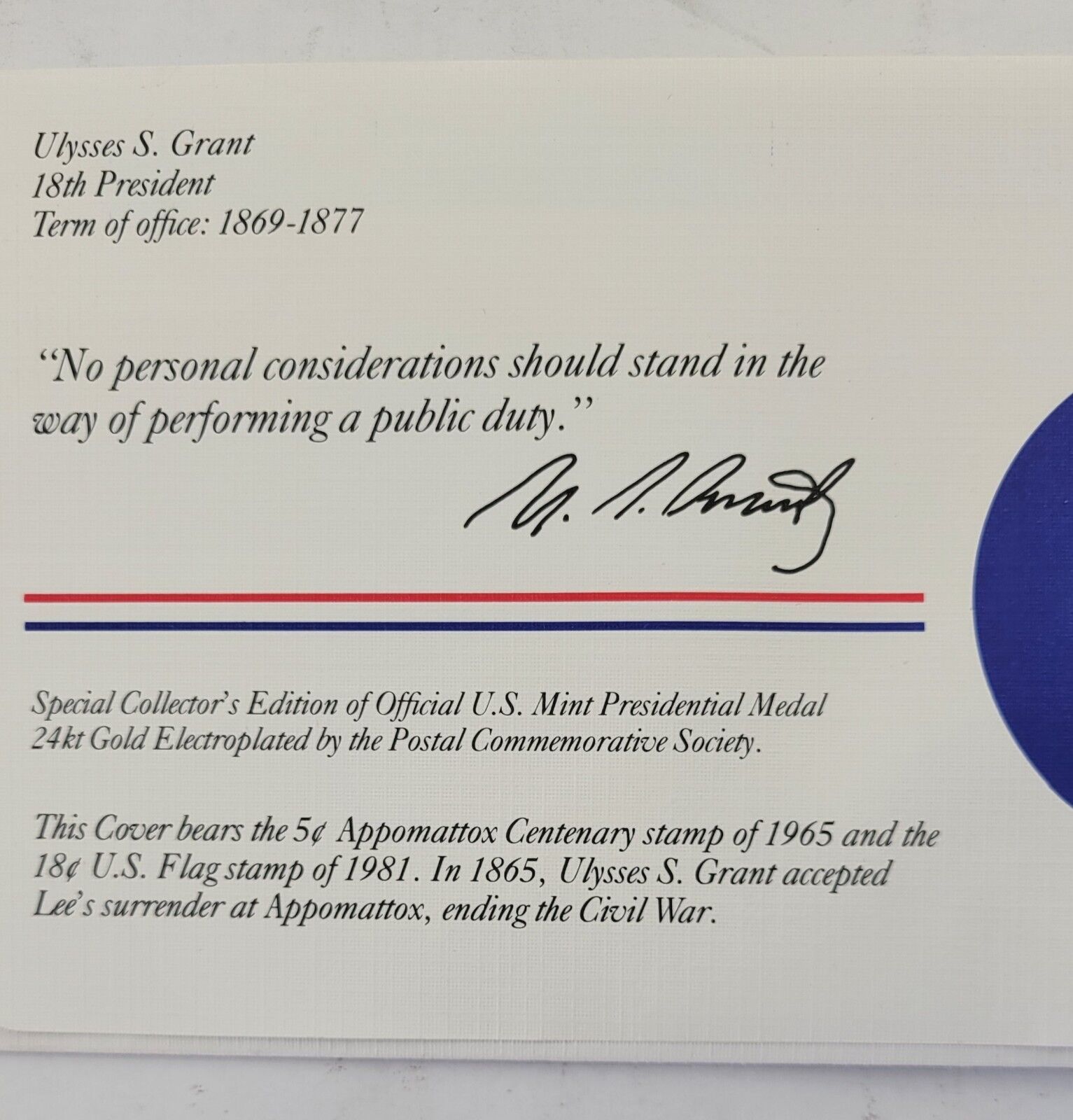 Ulysses Grant Presidential Covers Medal Postal Commemorative Society Gold Plated