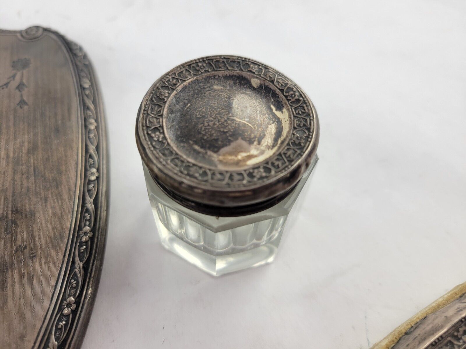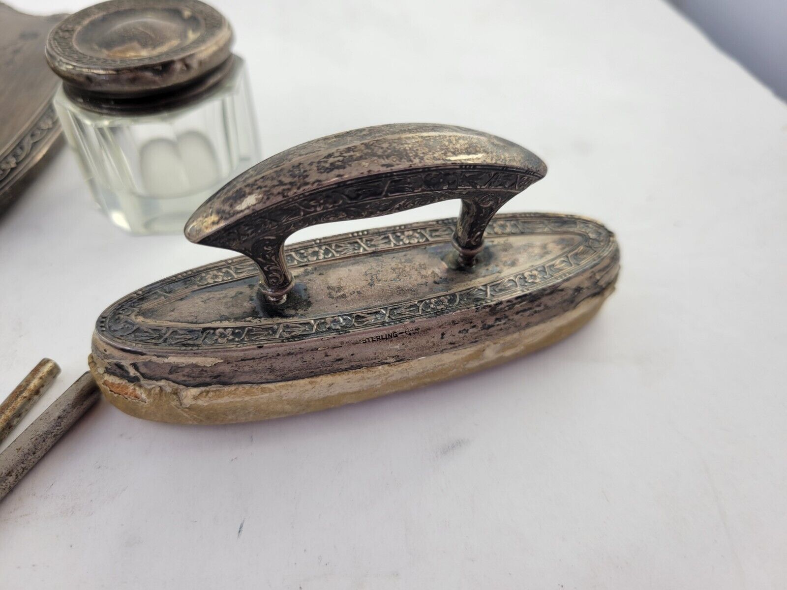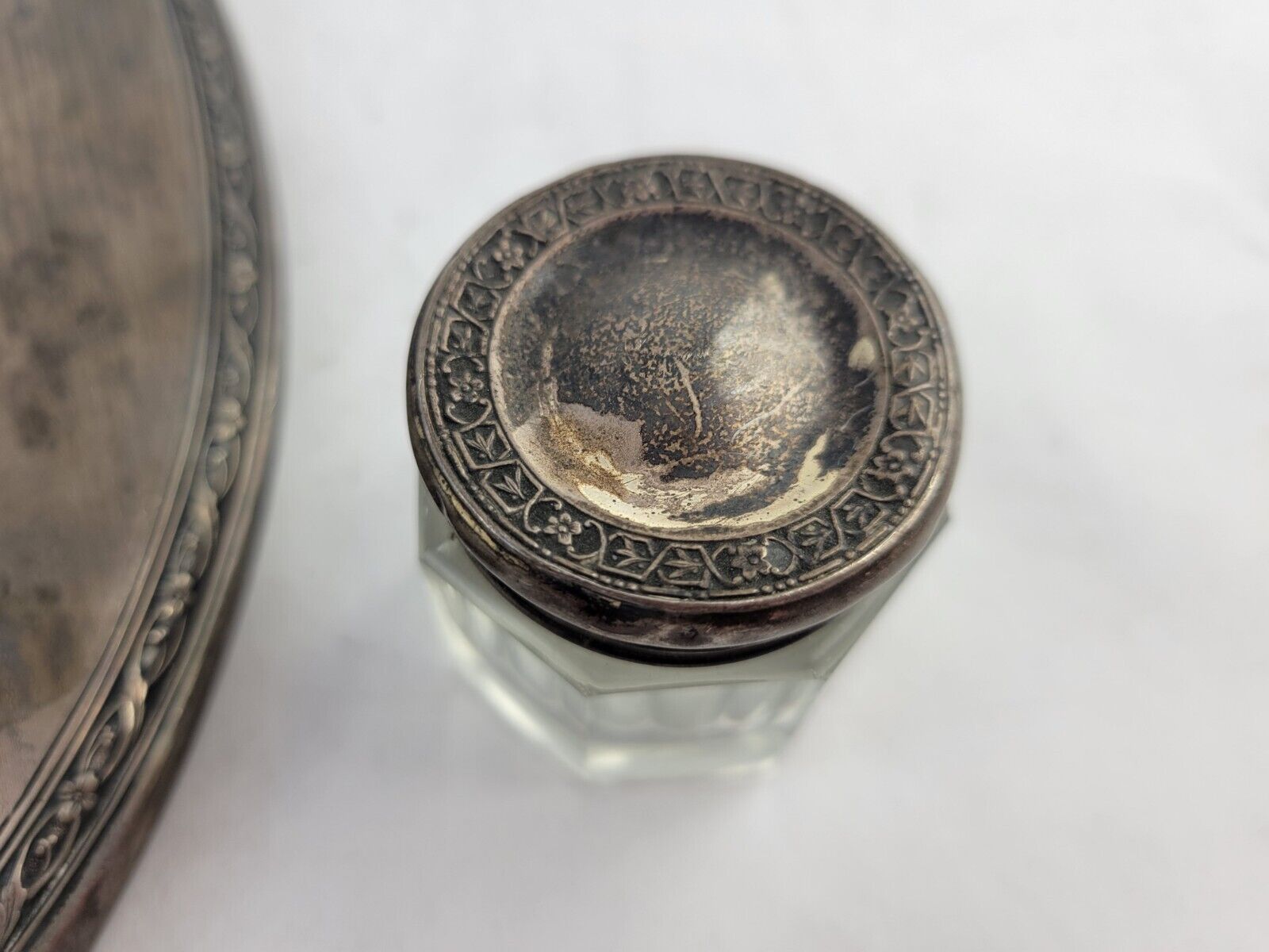 Victorian Sterling Repousse 5 Piece Vanity Set Mirror scissors Nail Buffer. Jar