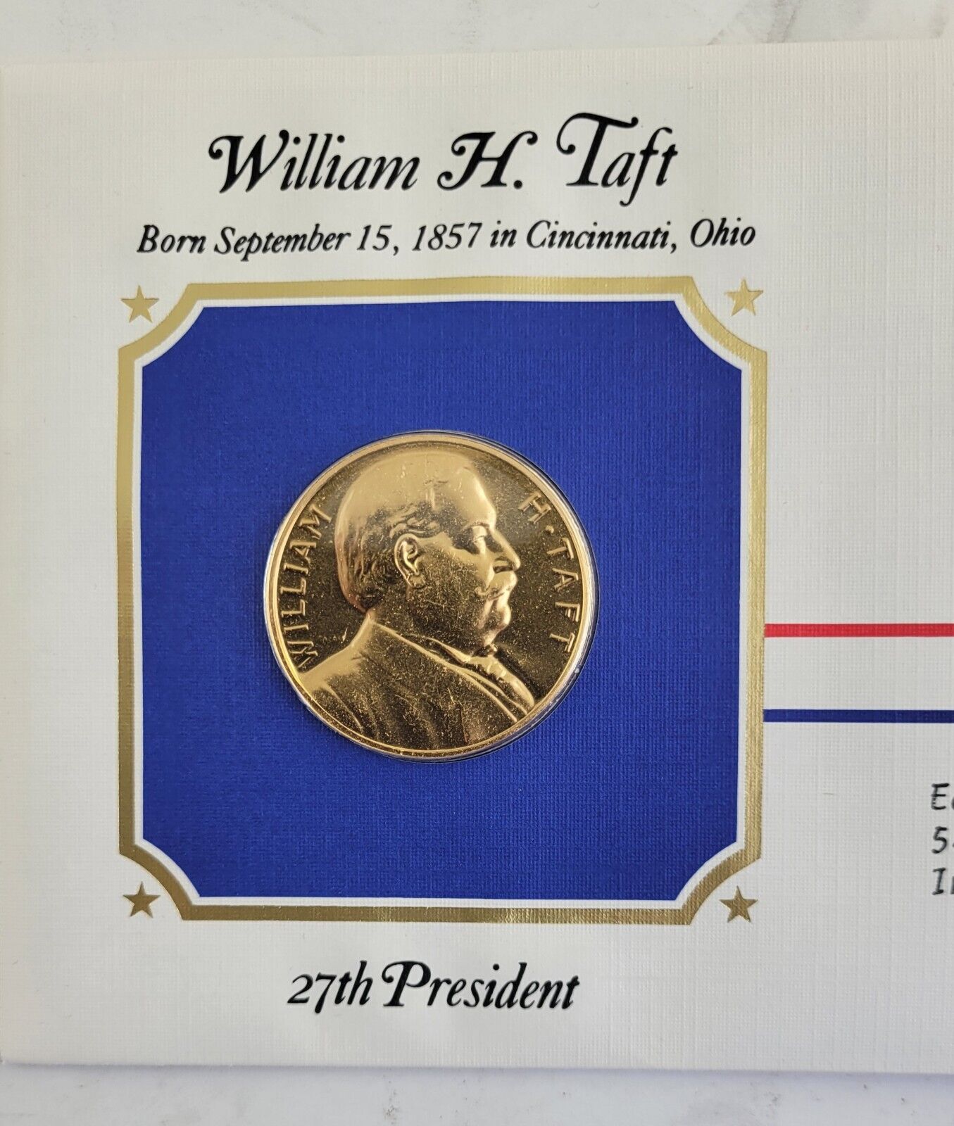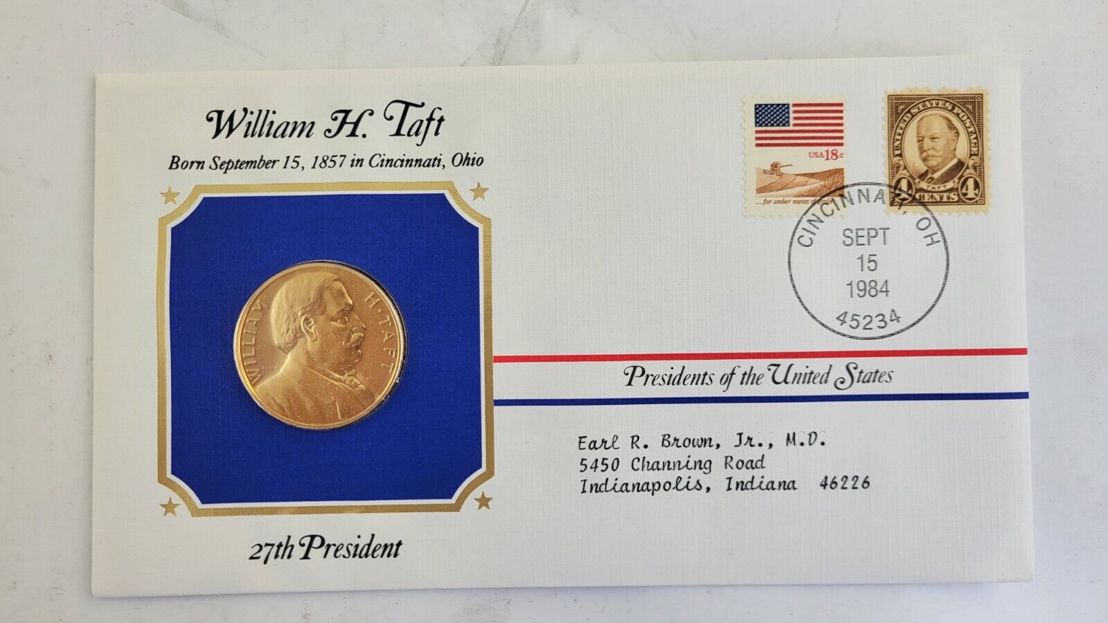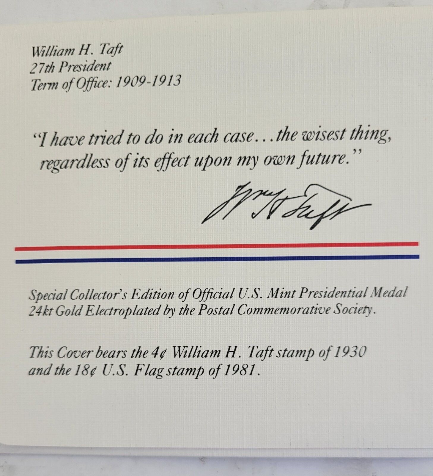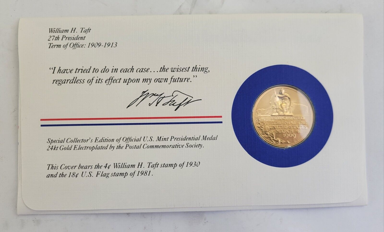 William Taft Presidential Covers Medal Postal Commemorative Society Gold Plated